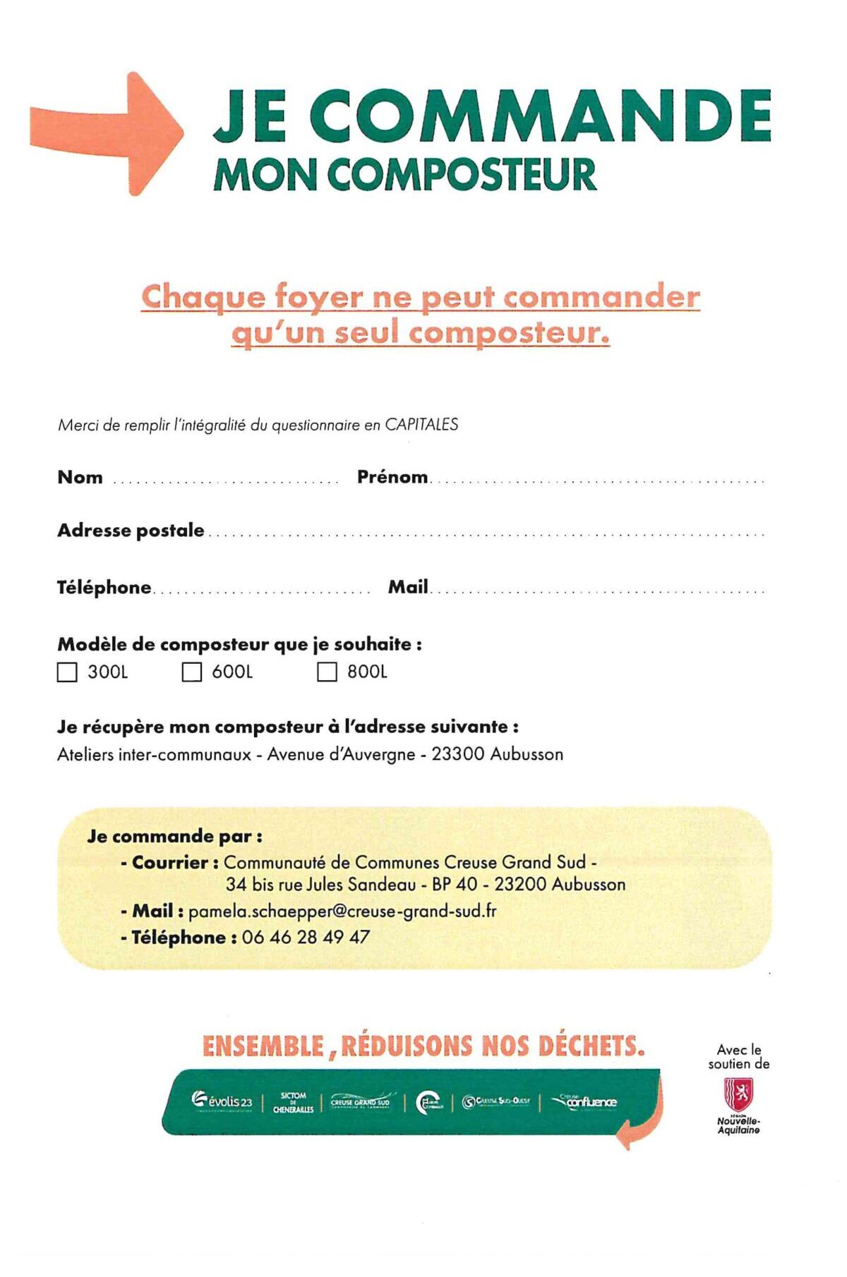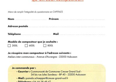 La diminution des quantités d’ordures ménagères est une nécessité. Trier les emballages dans les poubelles jaune est une bonne chose mais diminue peu le poids des déchets traités, il faut aller plus loin car il faut au moins diviser par deux le poids des déchets ménagers collectés. Il est indispensable de traiter chez soi les déchets compostables qui représentent eux des poids importants. Evolis 23 et la communauté de commune Creuse Grand Sud vous permettent de vous procurer un composteur par adresse à prix préférentiel. Il vous suffit de d’en faire la demande, vous recevrez la facture à régler avant la livraison.